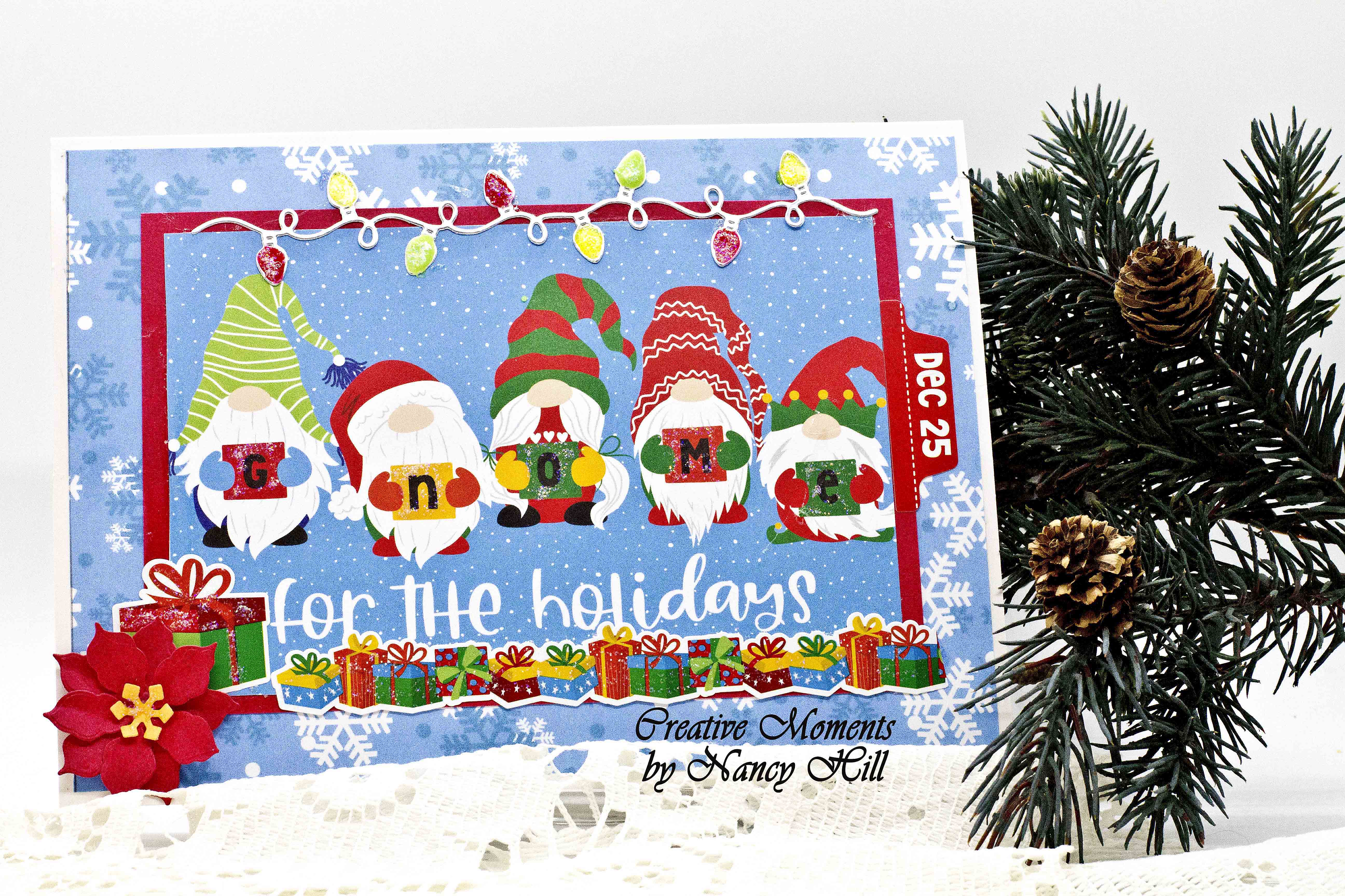 Welcome back and hope you are having a wonderful weekend. Nancy, here to share some very fun Christmas cards made with the adorable PhotoPlay Gnomes for Christmas and Photo Play Not a Creature Was Stirring to capture your holiday greetings with the gorgeous patterned papers, die cuts and stickers. These collections come in a pack or additional stickers are available separately. Also, there are coordinating paper packs that come in separate packs that add to these collections. This year, I bought extra stickers so that I don't run out since I love these PhotoPlay Christmas collections so much for most of my Christmas cards this year.